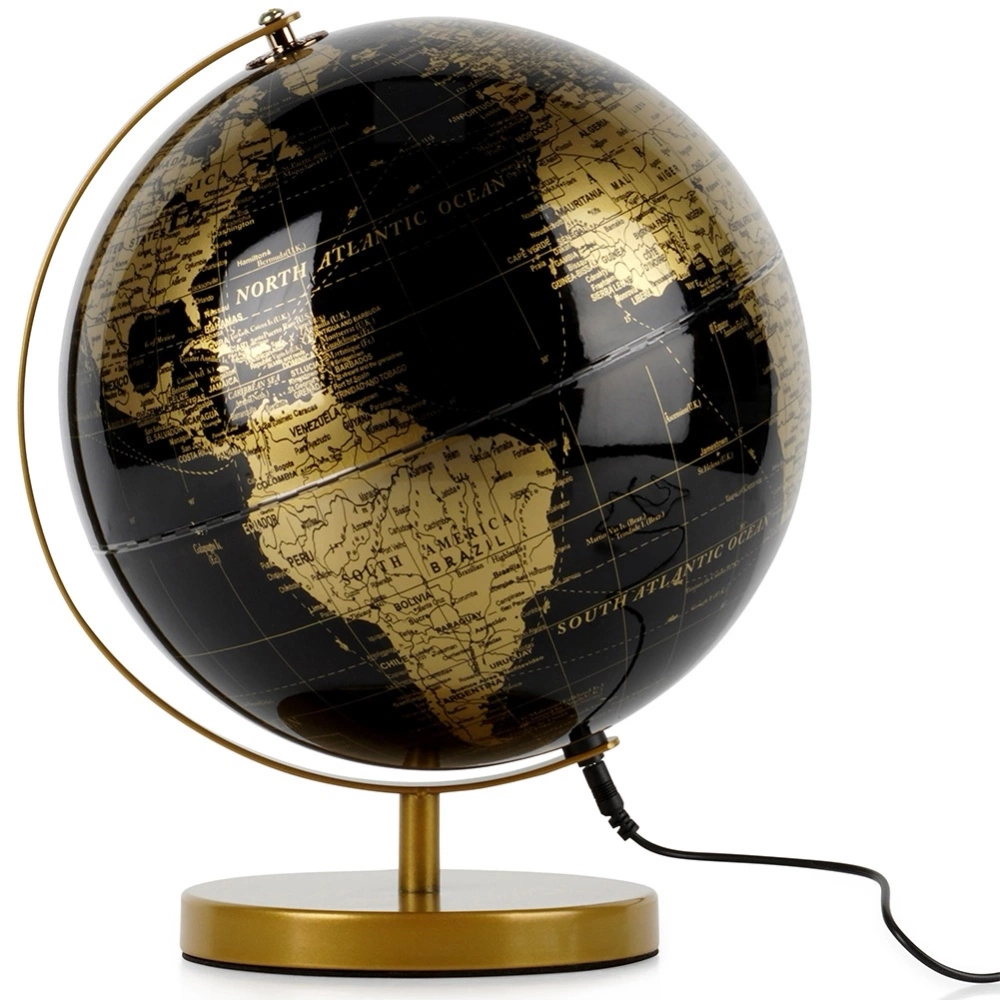 - Solidnie wykonana - Globus wykonany jest z tworzywa w czarnym i złotym kolorze. Podstawa globusa wykonana jest z metalu w złotym kolorze, co zapewnia stabilność lampki.