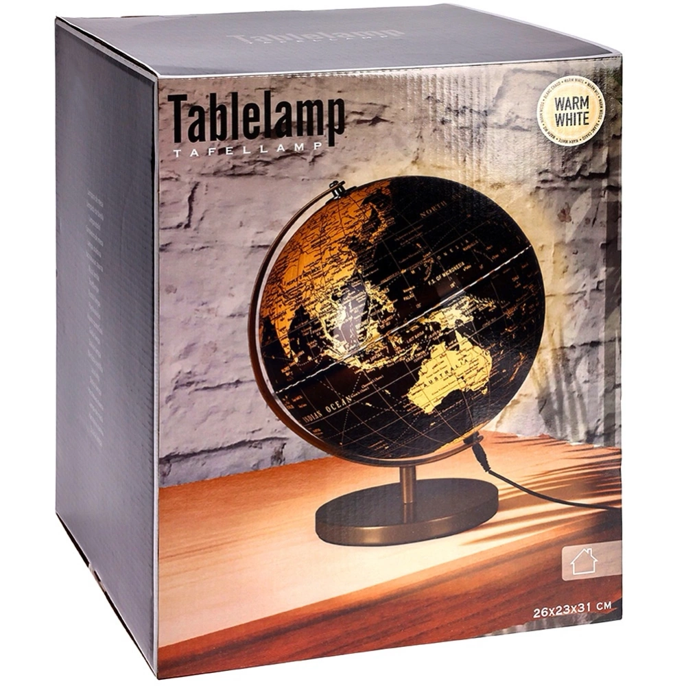 - Lampka stołowa w kształcie globusa - Dekoracyjna lampka stołowa w formie globusa, która tworzy nastrojowe oświetlenie i stanowi efektowny element wyposażenia wnętrza. Wymiary globusa to 26 x 25 x 31 cm.