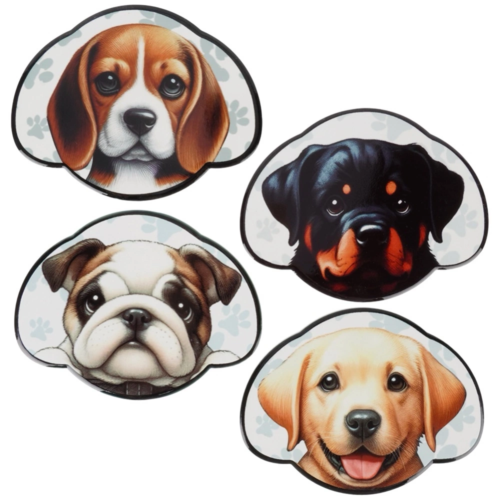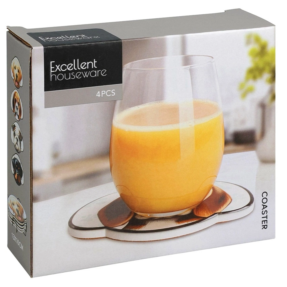- Zestaw 4 podstawek pod kubek w stojaku - Komplet czterech podstawek pod kubek w praktycznym stojaku. Każda podstawka posiada inną grafikę psa. Podstawki mają wymiary 14 x 10,5 x 0,5 cm i umieszczone są w praktycznym metalowym stojaku, który ułatwia ich przechowywanie. Podkładki umieszczone w stojaku mają wymiary 14 x 11 x 3,5 cm.