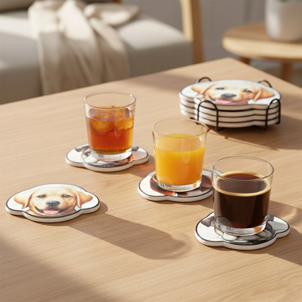 Zestaw podstawek pod kubek z praktycznym stojakiem. Podstawki są bardzo efektowne i każda z nich ma grafikę przedstawiającą innego psa. Ochroni blat przed zabrudzeniami i śladami po napojach. Dzięki stojakowi komplet prezentuje się elegancko i jest zawsze gotowy do użycia. To funkcjonalna ozdoba stołu i świetny pomysł na upominek dla miłośników zwierząt. Wyprodukowano zgodnie z europejskimi standardami.