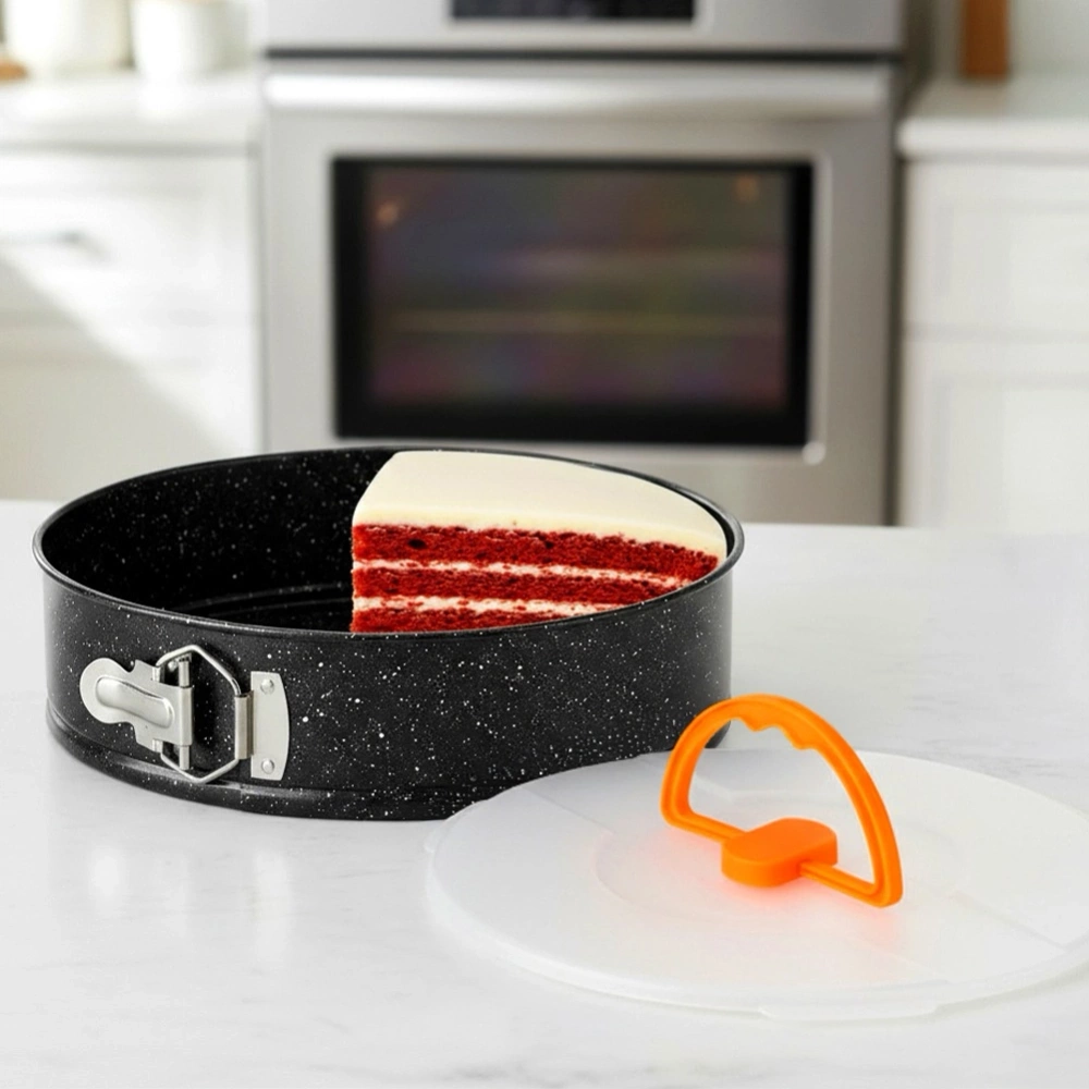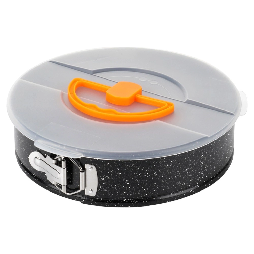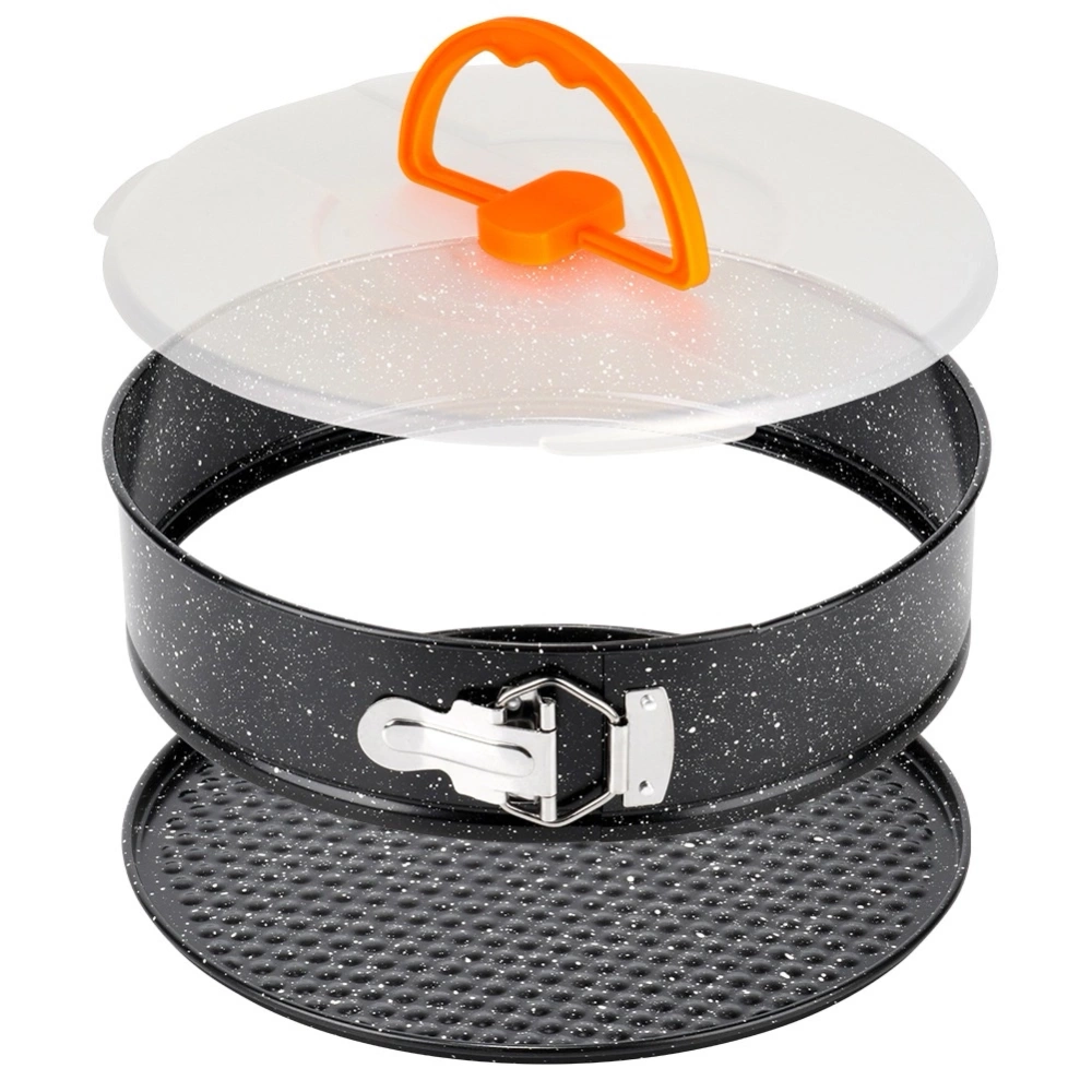 - Okrągła forma do pieczenia ciast z granitową powłoką. Brzegi tortownicy są rozpinane. W zestawie pokrywka z uchwytem do przenoszenia i przechowywania wypieków.