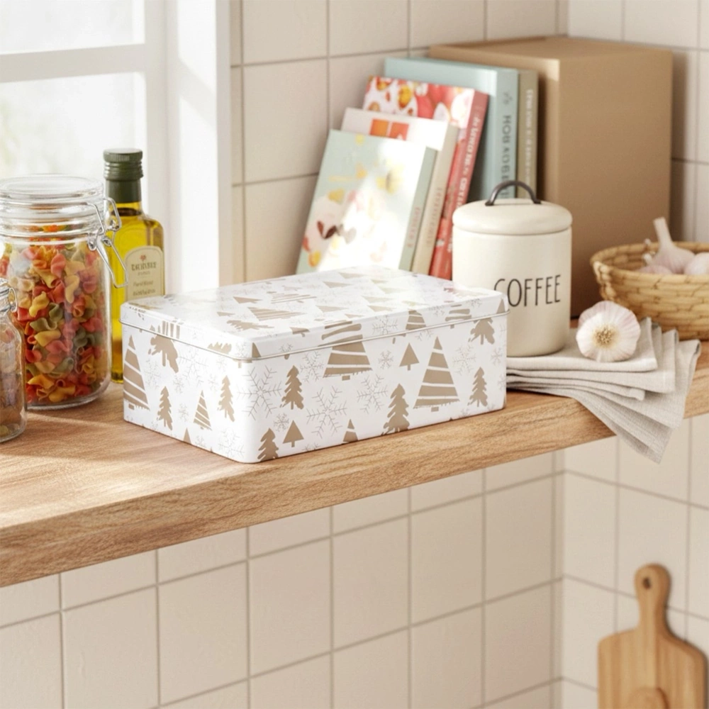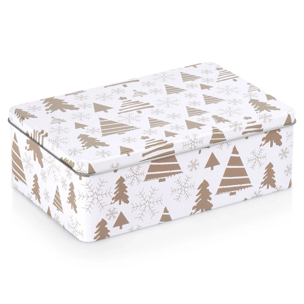Prostokątny pojemnik ze świątecznym motywem. Posiada zamykaną pokrywkę, która zapewni szczelność. Pojemnik świetnie sprawdzi się na ciastka, świąteczne gadżety, ale również opakowanie prezentowe, a postawiony na stole, kredensie lub półce, będzie stanowić wyjątkową ozdobę. Doskonały pomysł na upominek. Oryginalny produkt marki Vilde. Wyprodukowano zgodnie z europejskimi standardami.