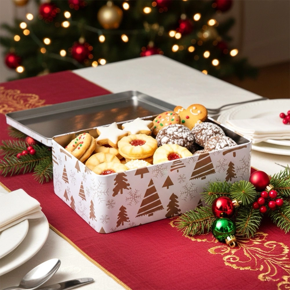 - Pojemnik w formie puszki ze świątecznym motywem - Praktyczna puszka do przechowywania ciasteczek, słodyczy, herbaty oraz drobiazgów. Idealna do wykorzystania w kuchni, biurze lub jako ozdobne pudełko prezentowe. Pojemnik ma wymiary 20 x 13 x 7 cm.
