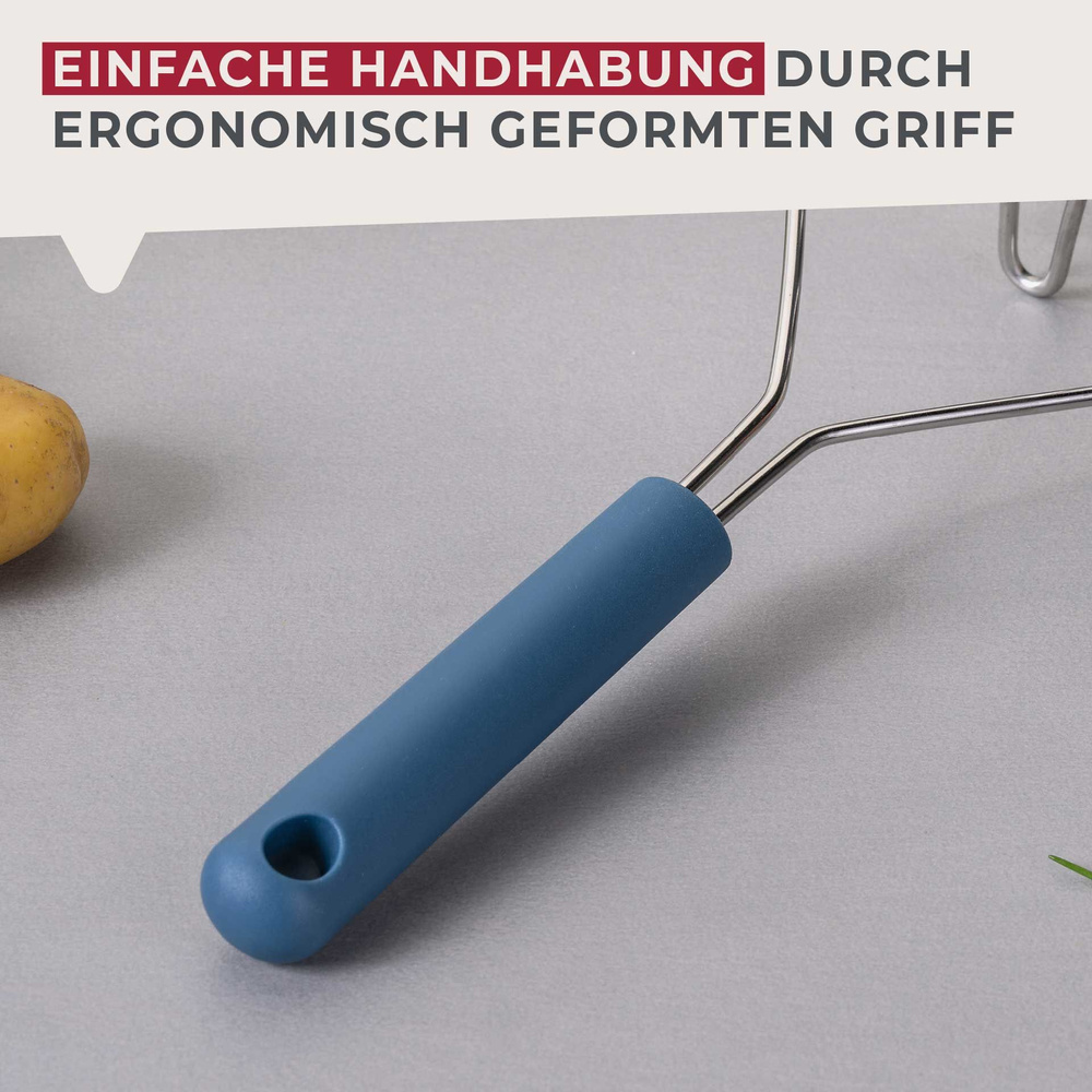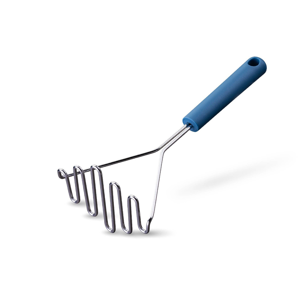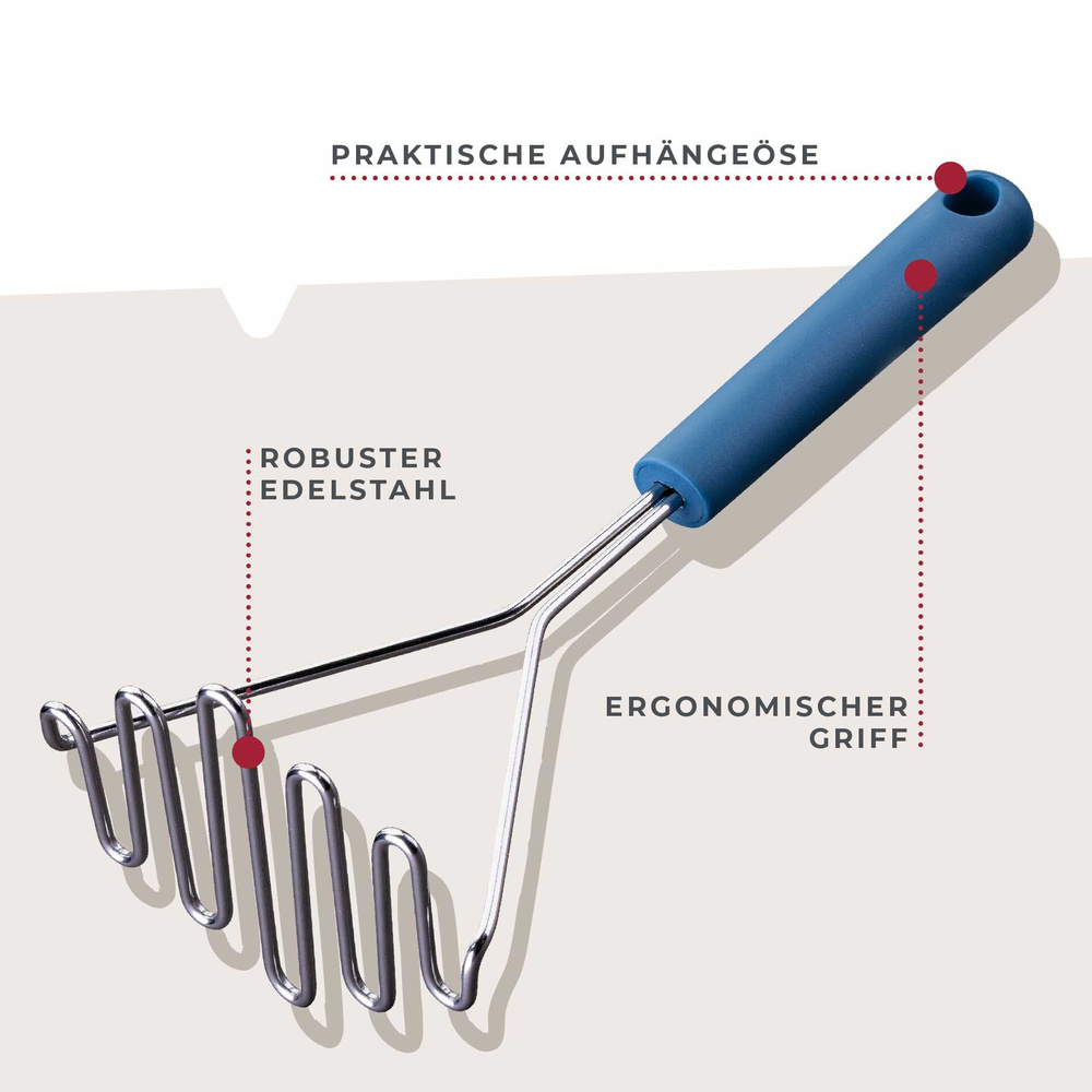 Ergonomicznie uformowany uchwyt z ciemnoniebieskiego plastiku wygodnie leży w dłoni, co gwarantuje pewny chwyt podczas pracy. Tłuczek o wymiarach 25 x 11,5 x 8 cm jest łatwy do przechowywania dzięki praktycznej pętli do zawieszenia. Po gotowaniu wystarczy umyć go w zmywarce, co czyni go idealnym narzędziem do każdej kuchni!