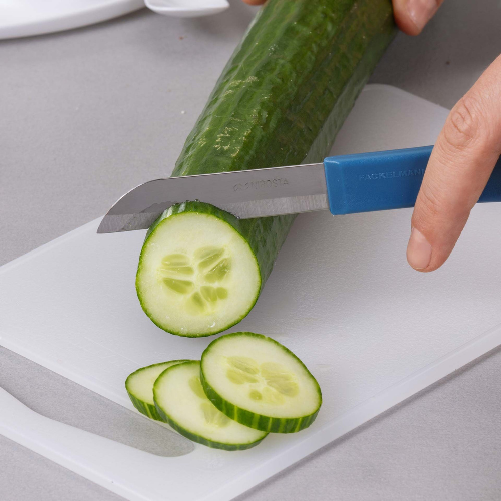 Ciemnoniebieska rękojeść z wytrzymałego plastiku zapewnia komfort użytkowania, a kompaktowa długość 16,5 cm sprawia, że nóż jest idealny do codziennego użytku. Wybierz nóż do warzyw Fackelmann, aby wprowadzić więcej lekkości i precyzji do swojej kuchni! 🔥