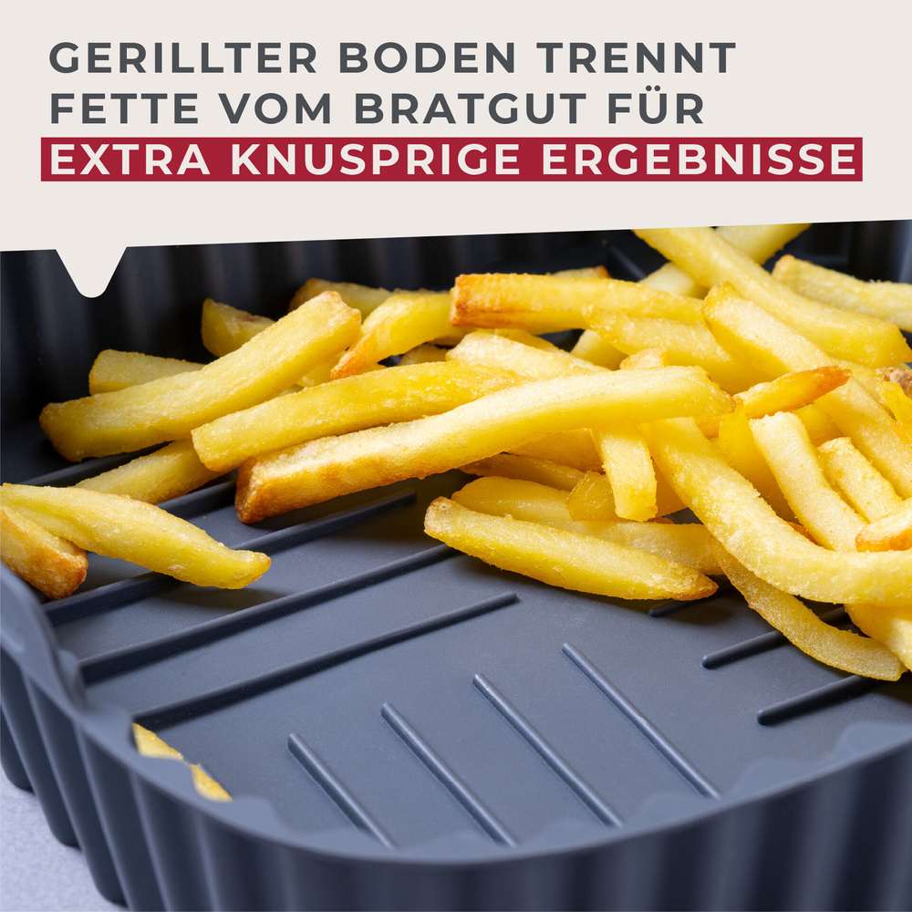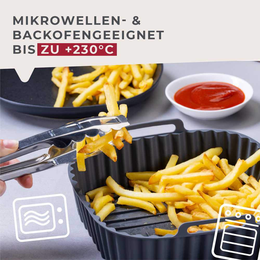 - Odkryj wygodę i wszechstronność gotowania z formą silikonową Fackelmann, idealną do frytkownicy na gorące powietrze, która pozwoli Ci przygotować chrupiące, zdrowe potrawy bez przyklejania się, a także ułatwi czyszczenie dzięki możliwości mycia w zmywarc