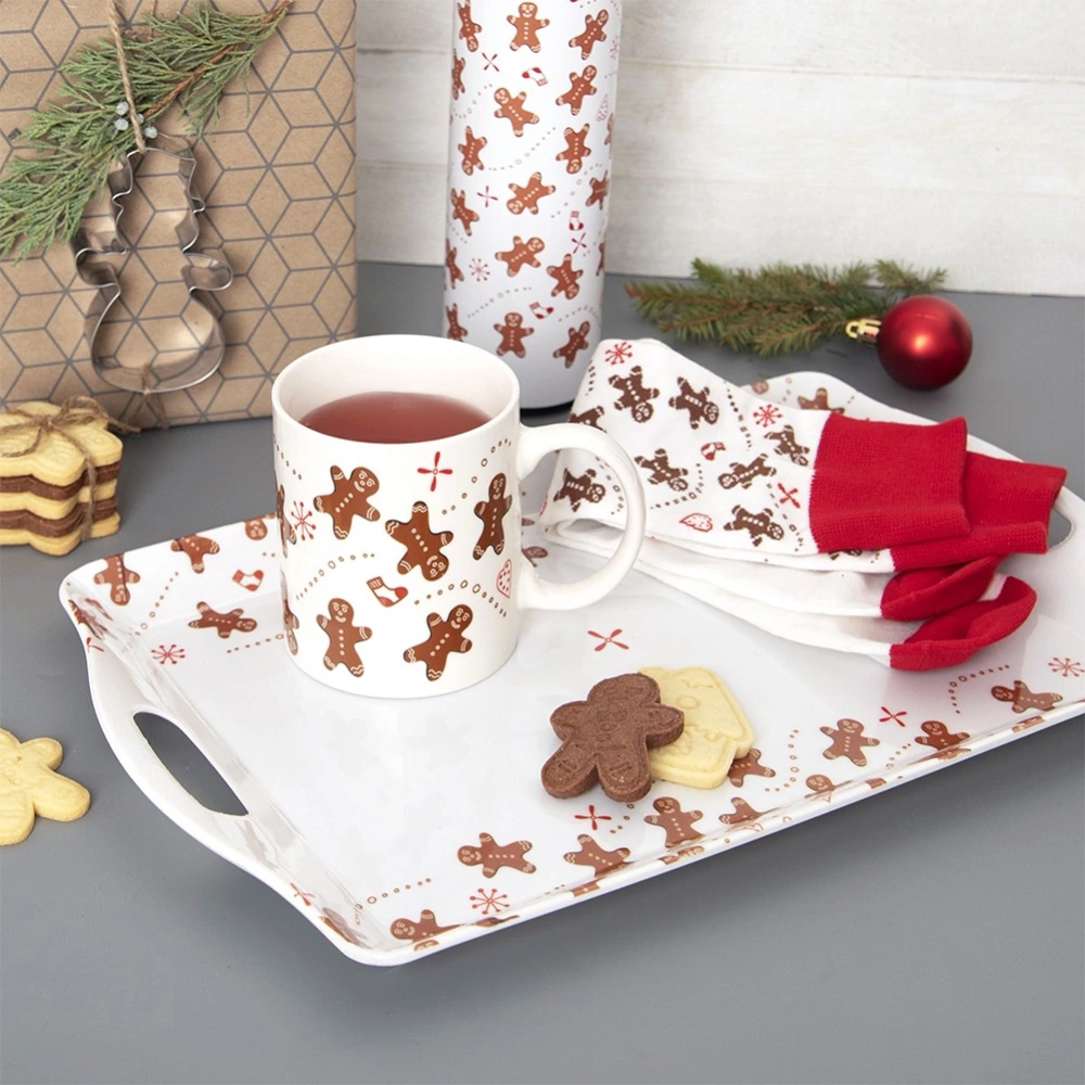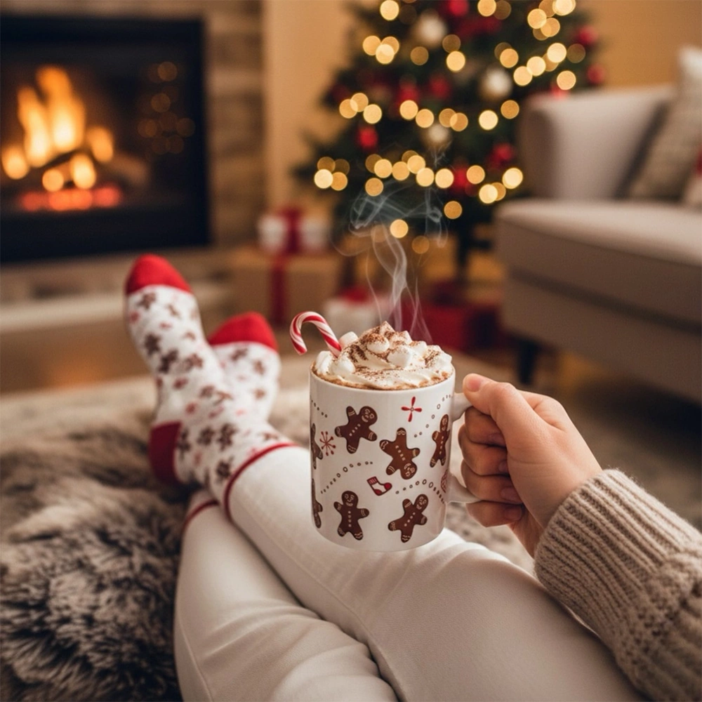 - Atrakcyjny motyw pierniczków - Kubek oraz skarpety zdobi uroczy motyw piernikowych ludzików, który nadaje zestawowi wyjątkowego i radosnego charakteru.