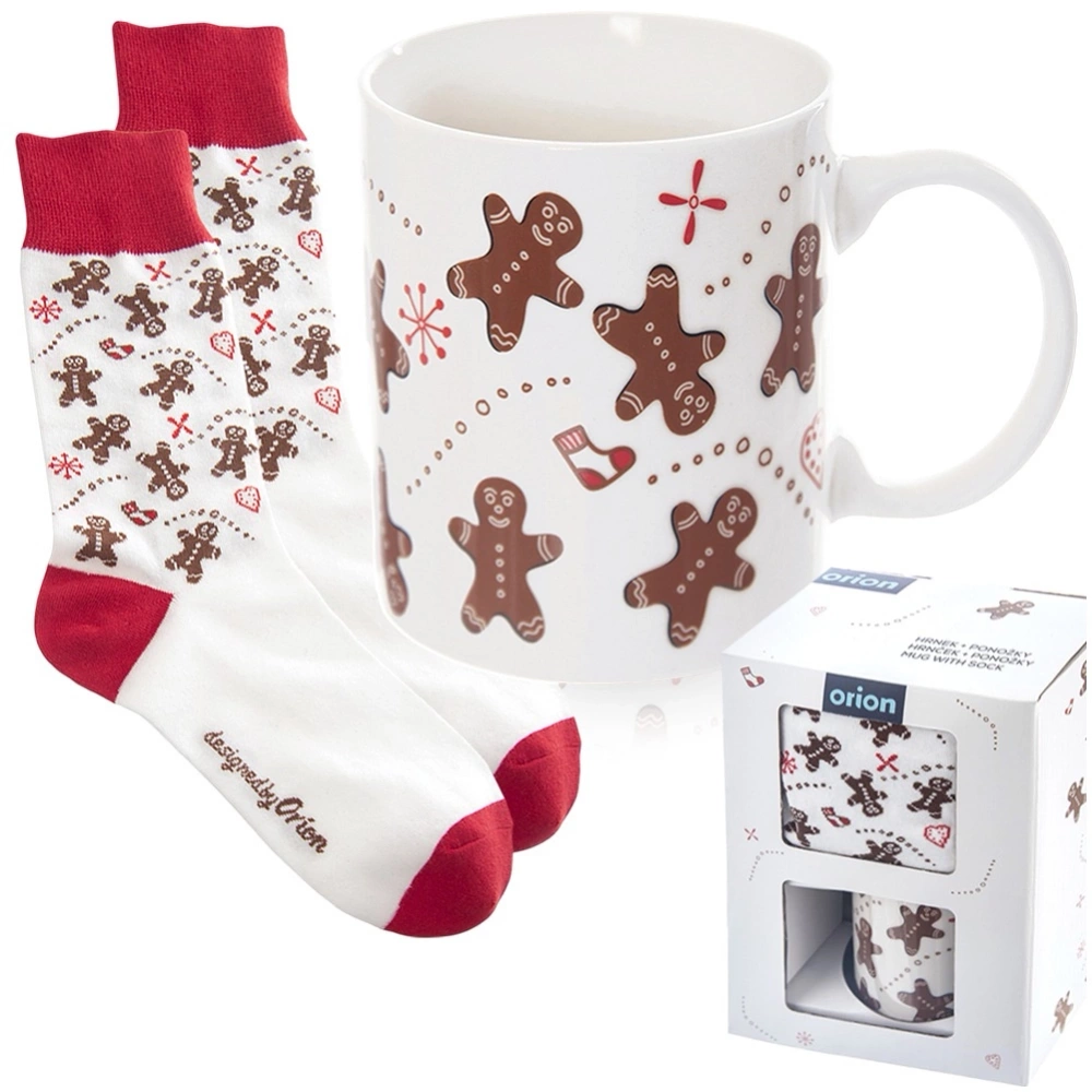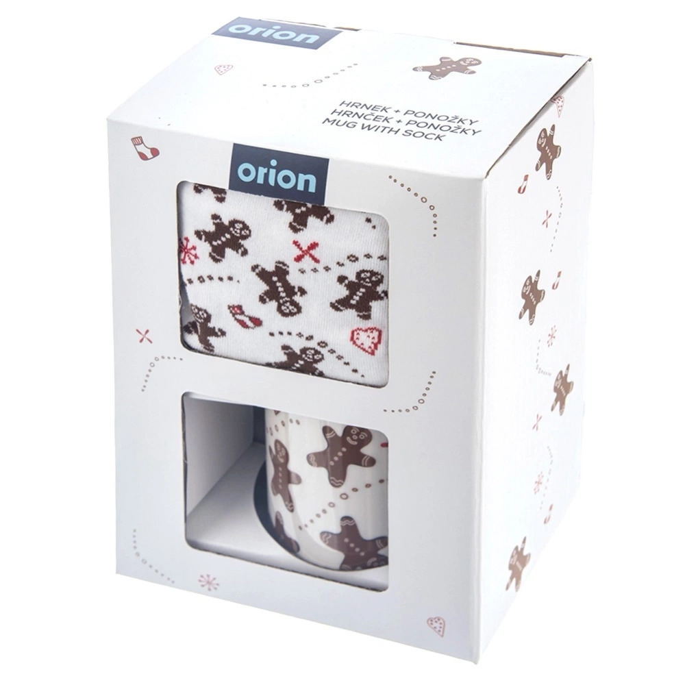 Zestaw składający się z kubka oraz miękkich skarpet z motywem piernikowego ludzika. Zestaw jest świetnym pomysłem na upominek dla bliskich w formie drobnego prezentu, który ucieszy każdego miłośnika zimowych akcentów. Oryginalny produkt czeskiej marki Orion. Wyprodukowano zgodnie z europejskimi standardami.
