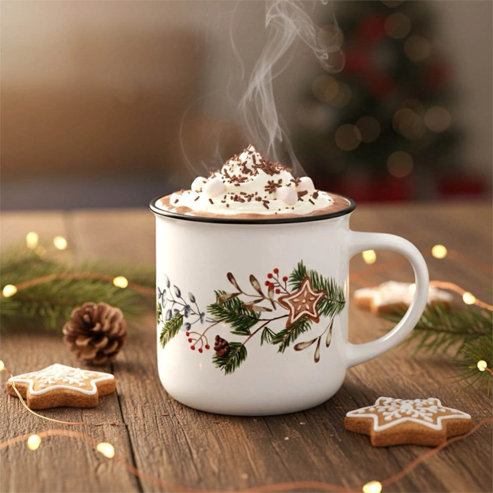 - Kubek z efektownym dekorem - Kubek z uchem do picia napojów, świetnie sprawdzi się w codziennym użytku. Idealny do picia herbaty, czekolady na gorąco, kawy, kakao, wina grzanego oraz innych napojów. To idealny towarzysz zimowych wieczorów. Kubek ozdobiono efektownym wzorem przedstawiającym gałązki iglaste z czerwonymi owocami oraz piernikową gwiazdkę w naturalnej, zimowej stylistyce. Kubek ma maksymalną pojemność 330 ml i wymiary 12,5 x 9 x 8,5 cm.