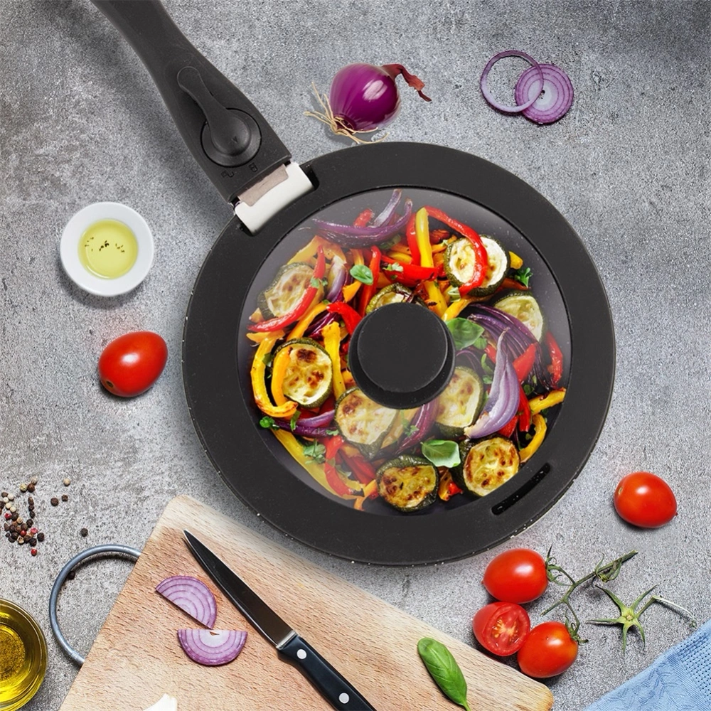 - Praktyczne wyprofilowanie do naczyń z odpinaną rączką - Pokrywka została zaprojektowana tak, aby idealnie przylegała do garnków i patelni wyposażonych w odpinaną rączkę. Boczne wycięcie ułatwia jej stosowanie podczas gotowania i pieczenia, również w piekarniku do temperatury 220°C.