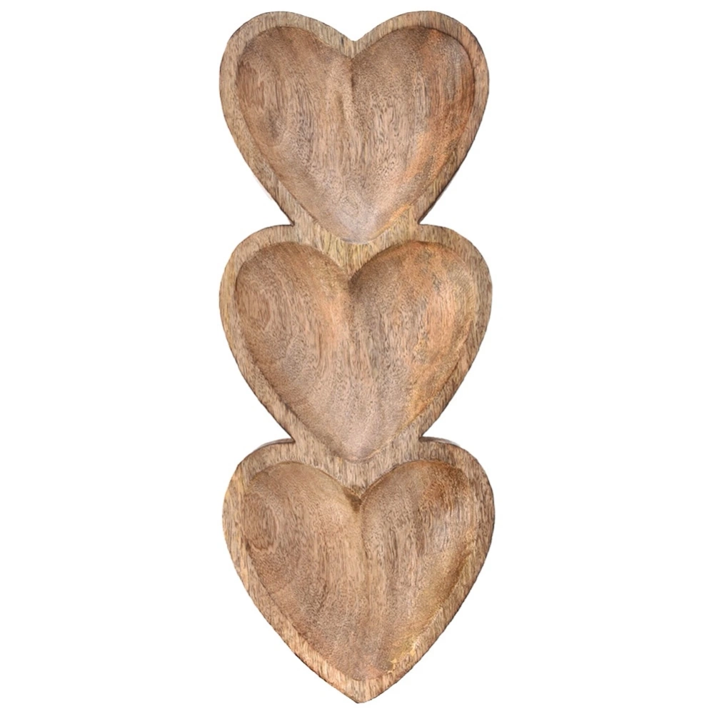 - Talerz do serwowania przekąsek słodkich lub słonych podzielony jest na trzy części w kształcie serc. Wykonany w całości, ręcznie z drewna mangowca.