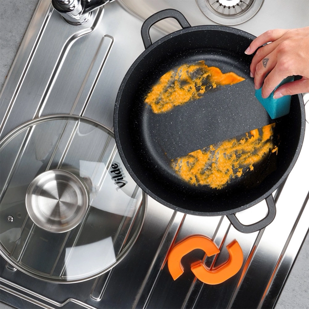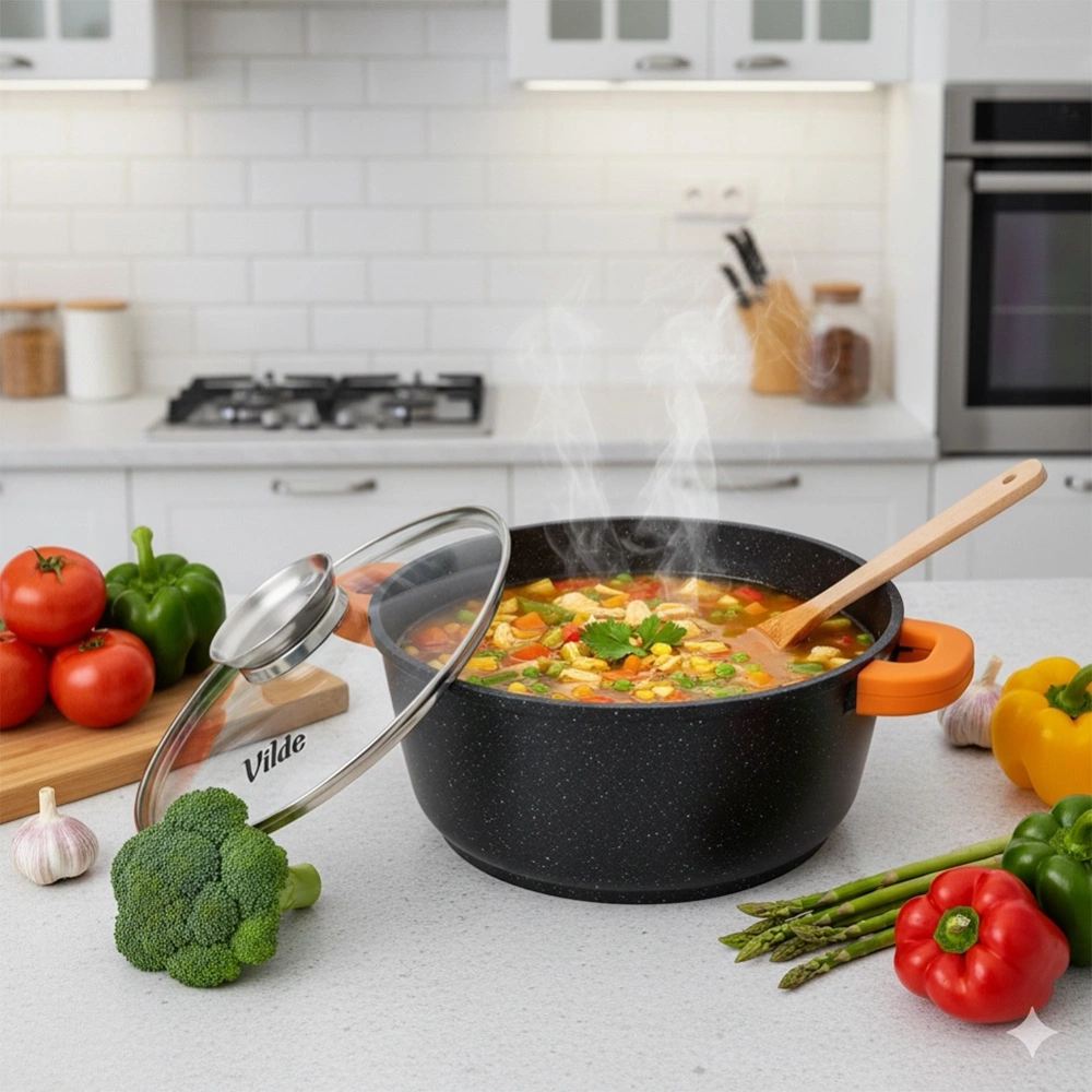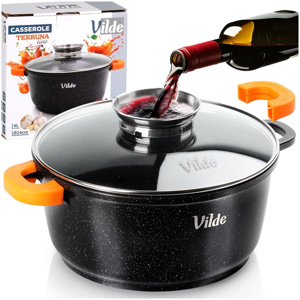 Uniwersalny garnek z pokrywką z dozownikiem oraz silikonowymi uchwytami, idealny do gotowania, pieczenia, duszenia i smażenia potraw. Przygotowane w nim dania są soczyste i aromatyczne. Garnek jest trwały, funkcjonalny i idealny do bezpośredniego serwowania dań na stole. Oryginalny produkt marki Vilde z linii Terruna Aroma. Wyprodukowano zgodnie z europejskimi standardami.