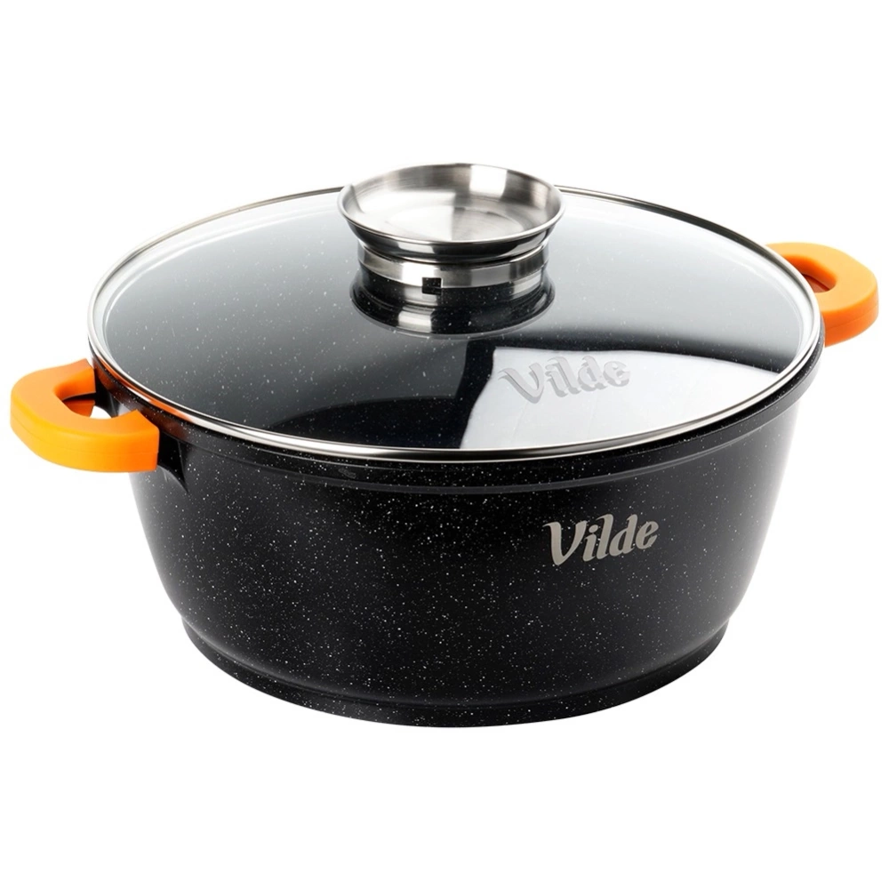 Duży garnek z pokrywką z dozownikiem oraz silikonowymi uchwytami, idealny do gotowania, pieczenia, duszenia i smażenia potraw. Przygotowane w nim dania są soczyste i aromatyczne. Garnek jest trwały, funkcjonalny i idealny do bezpośredniego serwowania dań na stole. Oryginalny produkt marki Vilde z linii Terruna Aroma. Wyprodukowano zgodnie z europejskimi standardami.