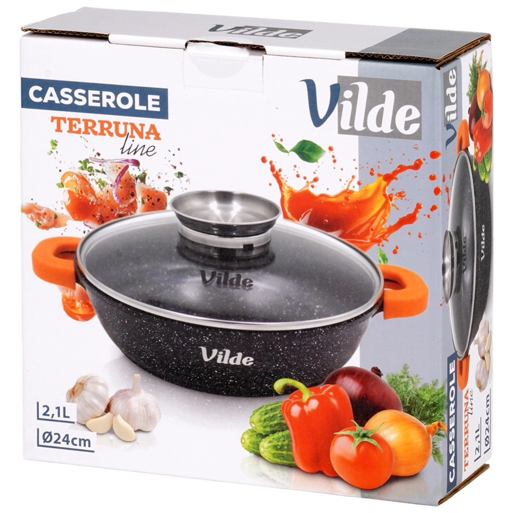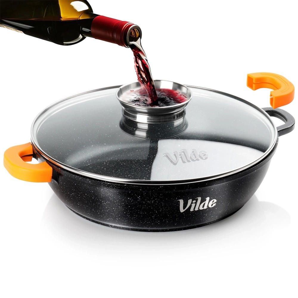 Głęboka patelnia z pokrywką z dozownikiem oraz silikonowymi uchwytami to funkcjonalne naczynie do smażenia, duszenia, pieczenia i przygotowywania sycących, aromatycznych potraw. Jest solidna, wygodna w użytkowaniu i doskonale sprawdzi się w każdej kuchni. Oryginalny produkt marki Vilde z linii Terruna Aroma. Wyprodukowano zgodnie z europejskimi standardami.
