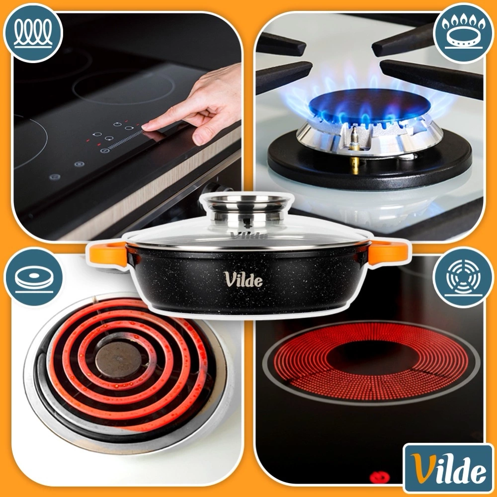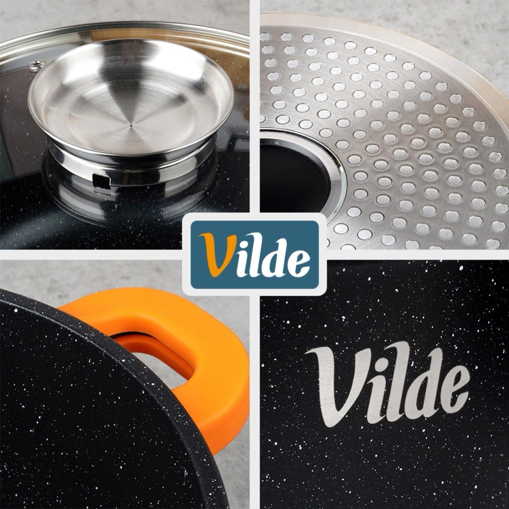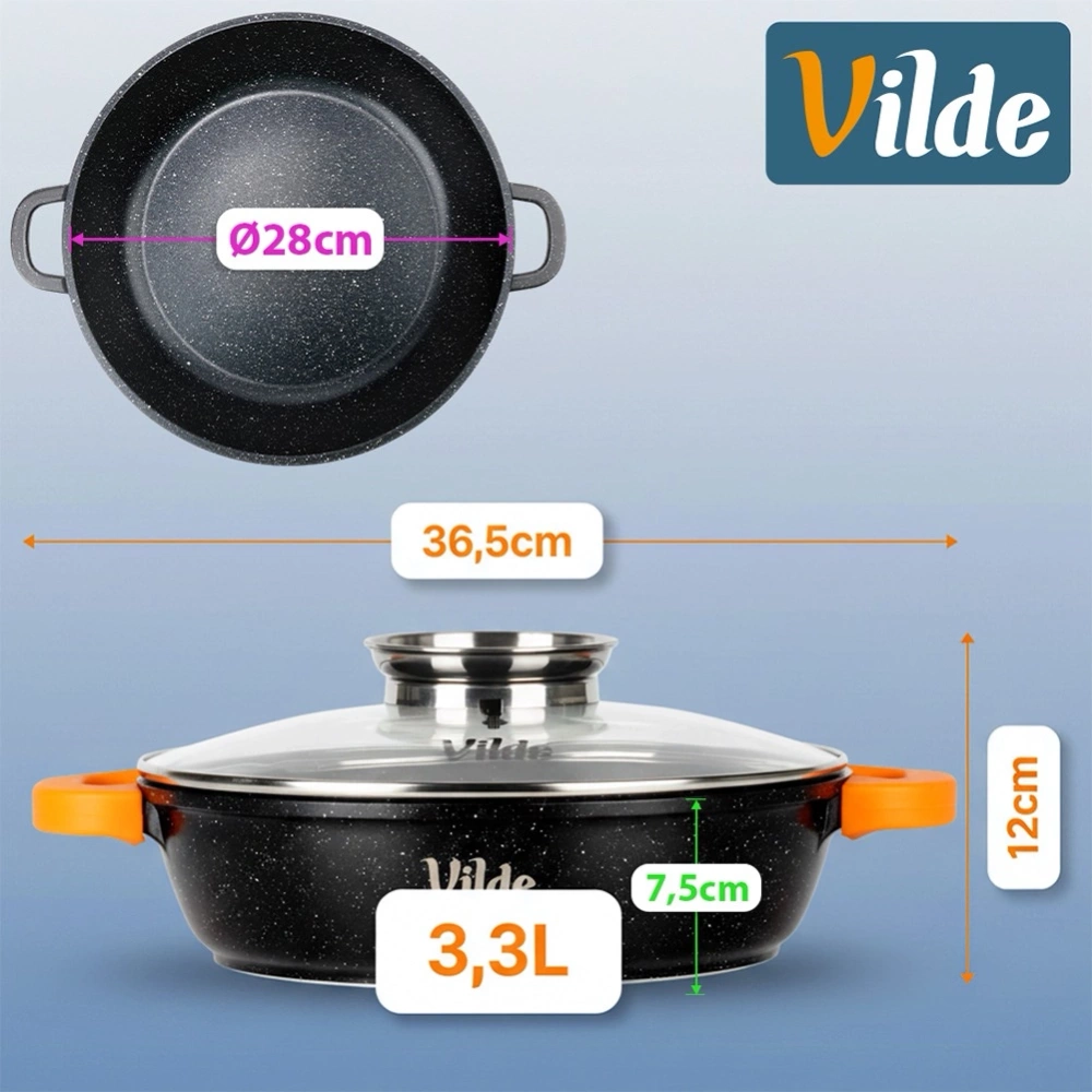 Głęboka patelnia z pokrywką z dozownikiem oraz silikonowymi uchwytami to funkcjonalne naczynie do smażenia, duszenia, pieczenia i przygotowywania sycących, aromatycznych potraw. Jest solidna, wygodna w użytkowaniu i doskonale sprawdzi się w każdej kuchni. Oryginalny produkt marki Vilde z linii Terruna Aroma. Wyprodukowano zgodnie z europejskimi standardami.