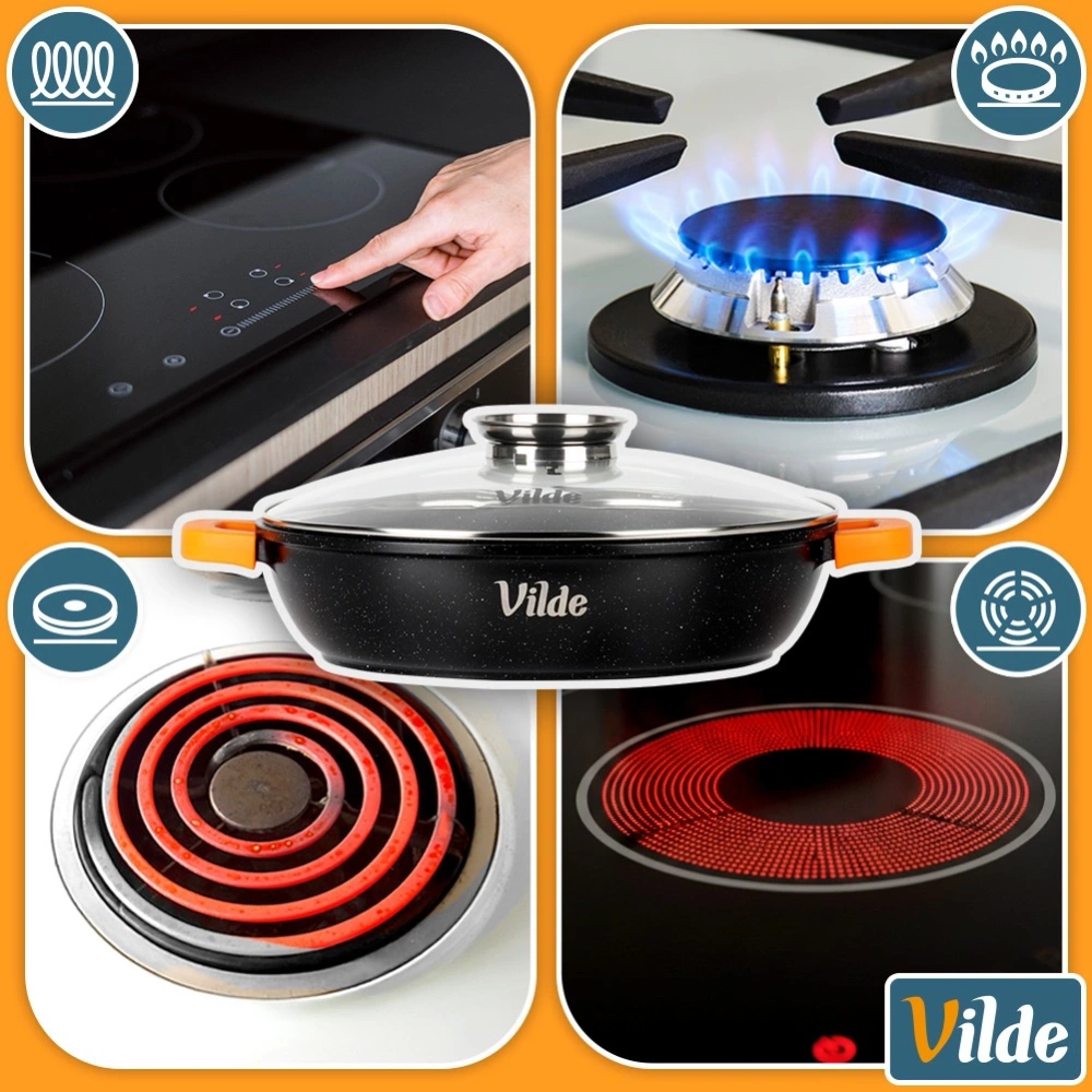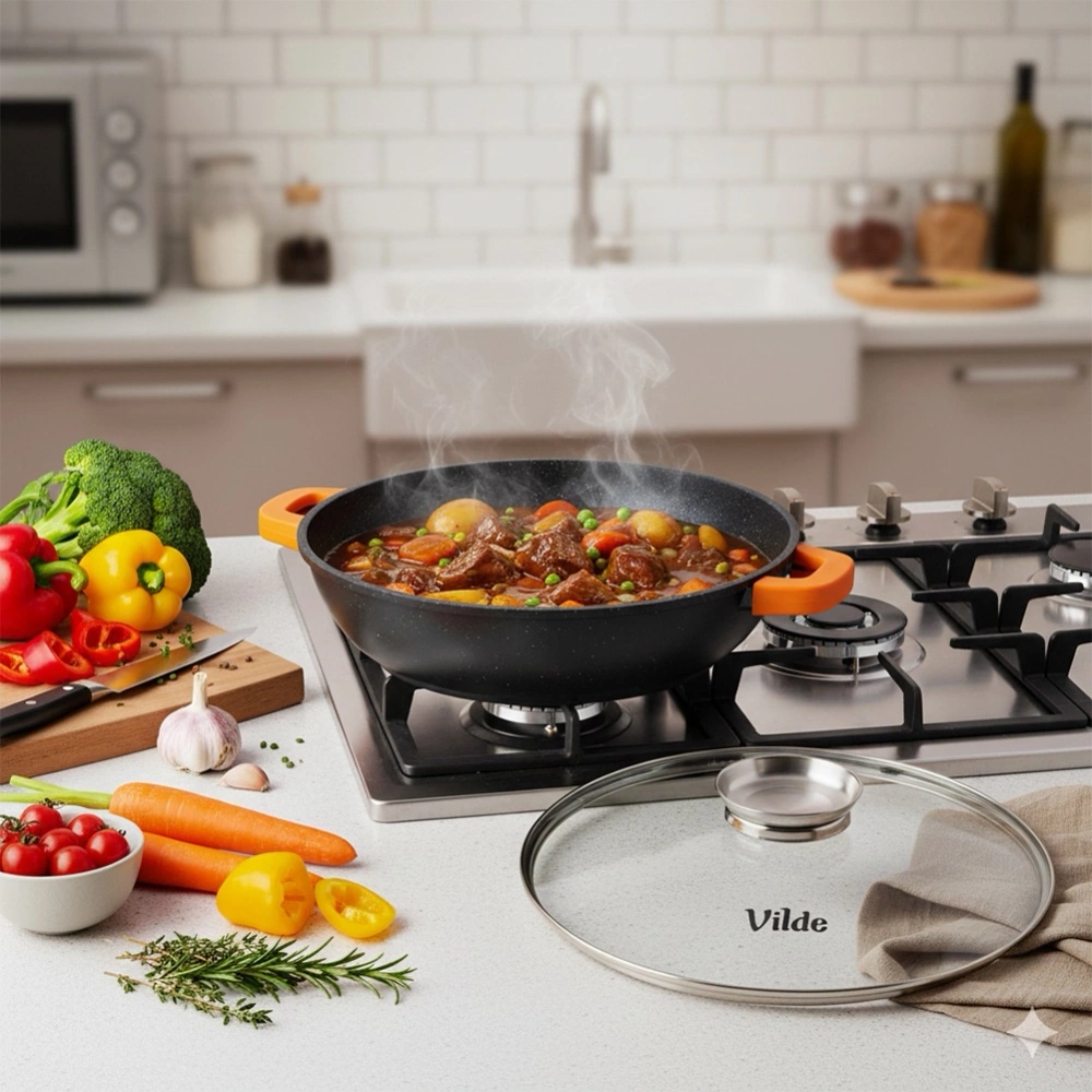 Głęboka patelnia z pokrywką z dozownikiem oraz silikonowymi uchwytami to funkcjonalne naczynie do smażenia, duszenia, pieczenia i przygotowywania sycących, aromatycznych potraw. Jest solidna, wygodna w użytkowaniu i doskonale sprawdzi się w każdej kuchni. Oryginalny produkt marki Vilde z linii Terruna Aroma. Wyprodukowano zgodnie z europejskimi standardami.