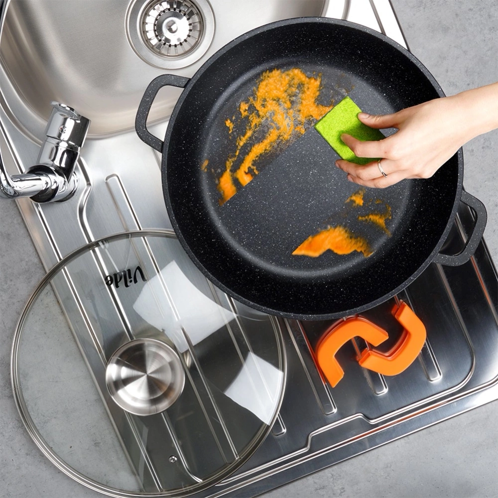 - Granitowa powłoka i żaroodporna pokrywka - Patelnia wykonana jest z odlewu aluminium z nieprzywierającą powłoką granitową, co umożliwia smażenie i duszenie na minimalnej ilości tłuszczu. Pokrywka jest żaroodporna, a jej uchwyt wykonano ze stali nierdzewnej. W zestawie znajdują się praktyczne silikonowe nakładki w pomarańczowym kolorze.