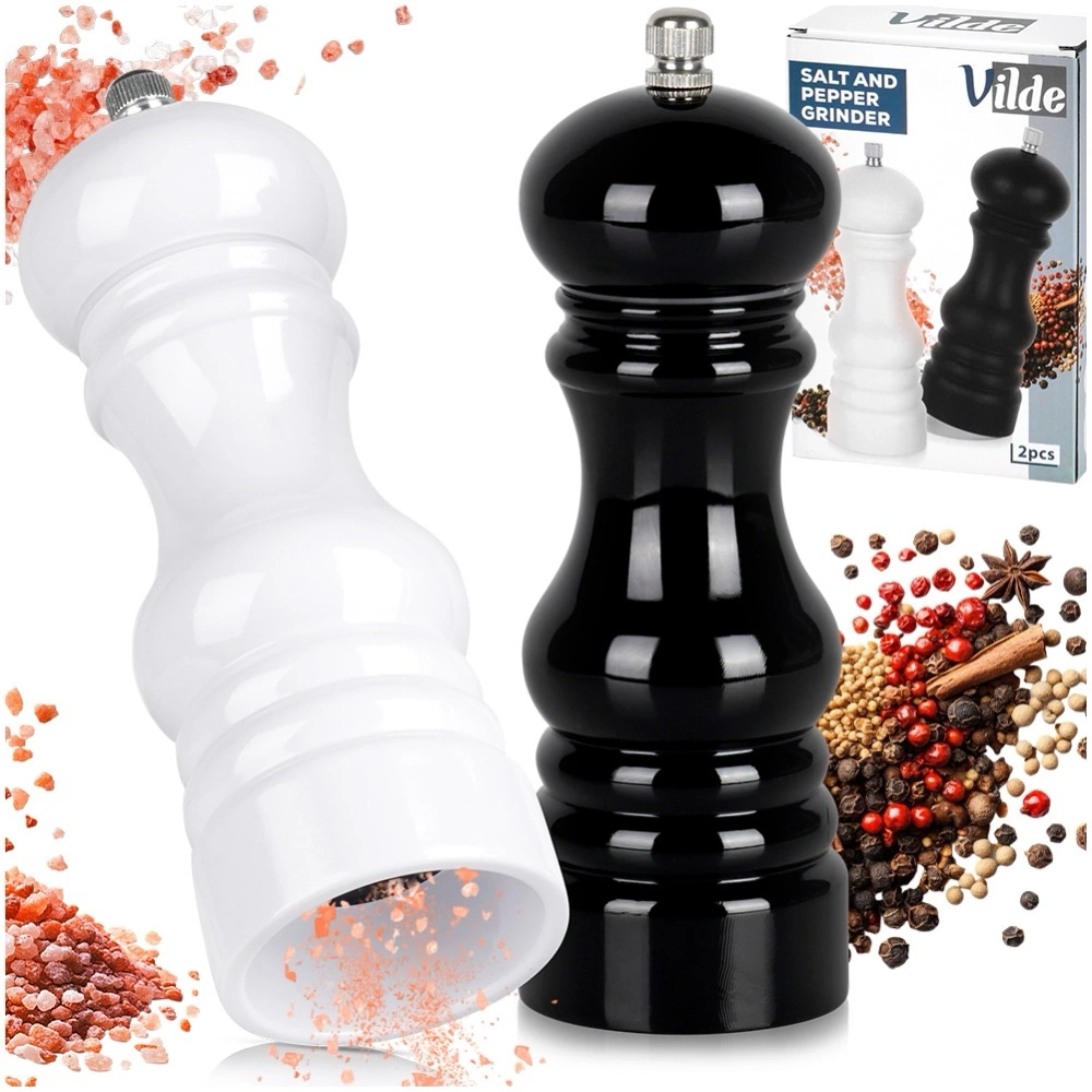 Zestaw składający się z dwóch ręcznych młynków, idealnych do pieprzu oraz soli. Niezbędny zestaw w każdej kuchni. Młynek pozwoli odpowiednio zmielić sól lub pieprz, a także inne przyprawy. Mielenie bezpośrednio przed podaniem pozwala na zachowanie świeżości oraz uwolnienie aromatu przypraw. Świetnie sprawdzą się w lokalach gastronomicznych. Oryginalny produkt marki Vilde. Wyprodukowano zgodnie z europejskimi standardami.