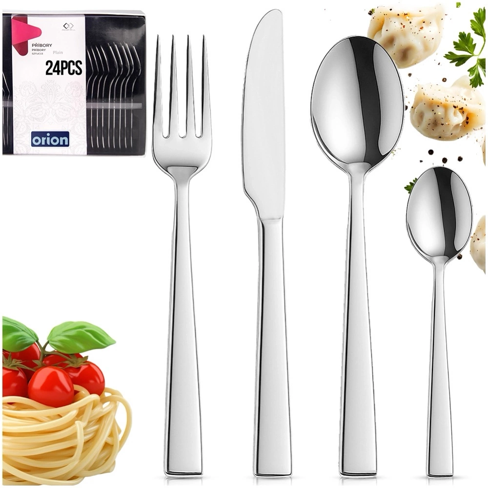 Zestaw sztućców dla sześciu osób składający się z 24 elementów. Niezwykle elegancko prezentują się na stole. Utrzymane w modnej kolorystyce. Będą pięknie prezentować się zarówno z zastawą klasyczną, jak i nowoczesną. Sprawdzą się na co dzień, jak również na specjalne okazje, uroczyste obiady czy przyjęcia. Oryginalny produkt czeskiej marki Orion. Wyprodukowano zgodnie z europejskimi standardami.