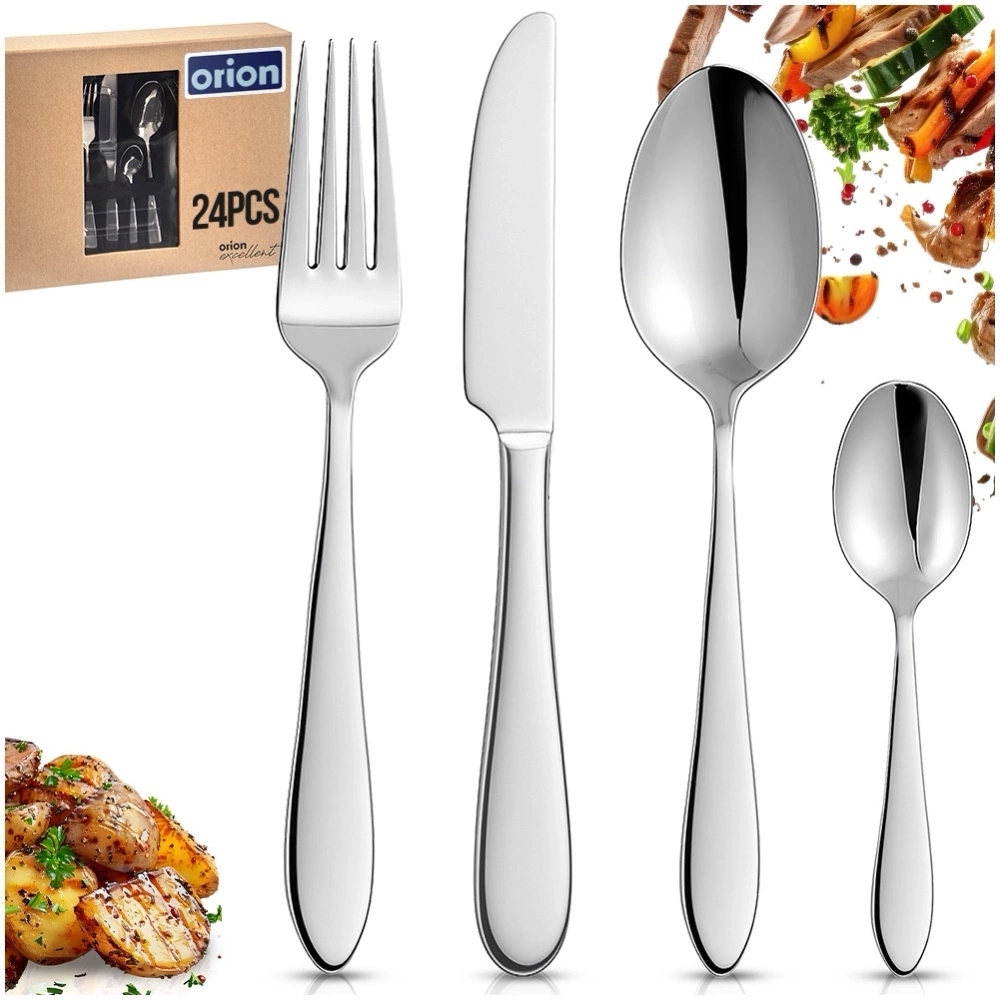 Zestaw sztućców dla sześciu osób składający się z 24 elementów. Niezwykle elegancko prezentują się na stole. Utrzymane w modnej kolorystyce. Będą pięknie prezentować się zarówno z zastawą klasyczną, jak i nowoczesną. Sprawdzą się na co dzień, jak również na specjalne okazje, uroczyste obiady czy przyjęcia. Oryginalny produkt czeskiej marki Orion. Wyprodukowano zgodnie z europejskimi standardami.