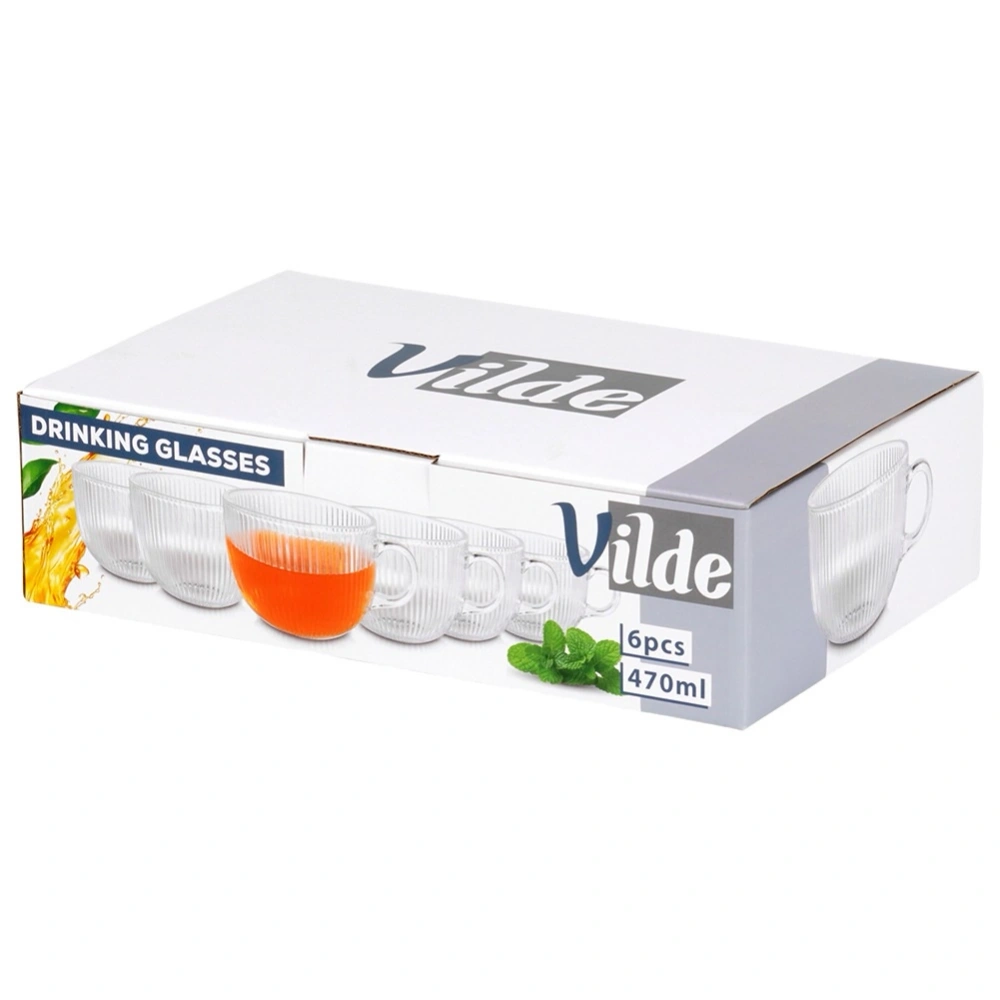 Zestaw sześciu szklanek XXL z uchem do picia kawy, herbaty i napojów. Niezwykle uniwersalne, posiadają ciekawy design. Będą stanowić piękną dekorację stołu oraz kuchni. Prosty i klasyczny kształt sprawia, że szklanki są bardzo wygodne w użytkowaniu. Idealnie sprawdzą się w użytku domowym. Można stosować je na co dzień. Łatwe w utrzymaniu czystości. Oryginalny produkt marki Vilde. Wyprodukowano zgodnie z europejskimi standardami.
