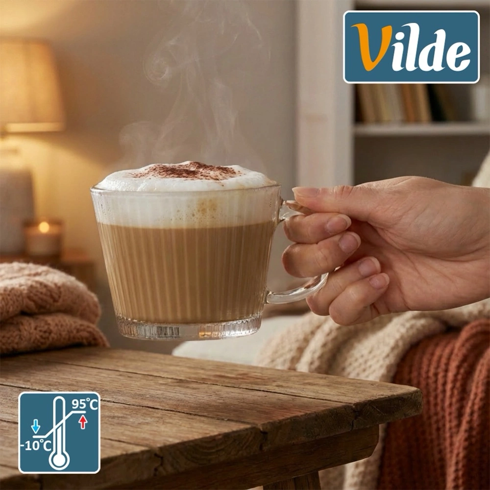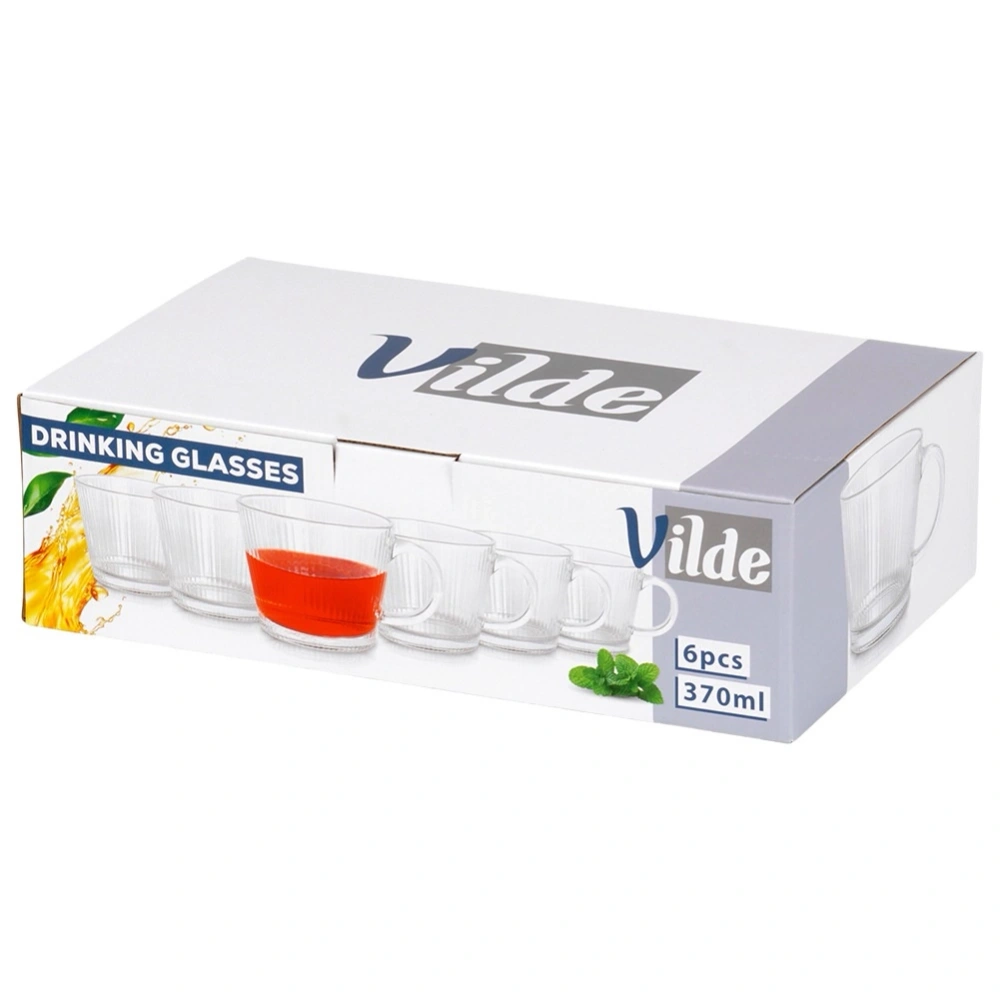 Zestaw sześciu szklanek XXL z uchem do picia kawy, herbaty i napojów. Niezwykle uniwersalne, posiadają ciekawy design. Będą stanowić piękną dekorację stołu oraz kuchni. Prosty i klasyczny kształt sprawia, że szklanki są bardzo wygodne w użytkowaniu. Idealnie sprawdzą się w użytku domowym. Można stosować je na co dzień. Łatwe w utrzymaniu czystości. Oryginalny produkt marki Vilde. Wyprodukowano zgodnie z europejskimi standardami.