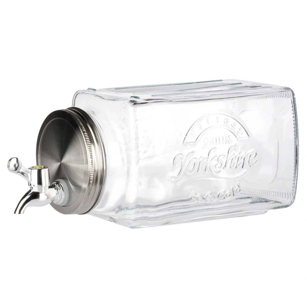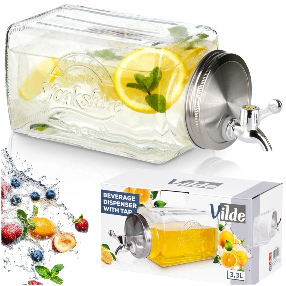 - Słój do napojów z kranikiem o pojemności 3,3 l - Dystrybutor do napojów z kranikiem o pojemności 3,3 l, przystosowany do położenia w lodówce. Idealny do serwowania lemoniady w gorące dni, ponczu lub soku podczas imprezy. Wymiary słoju 32 x 13,5 x 14 cm.
