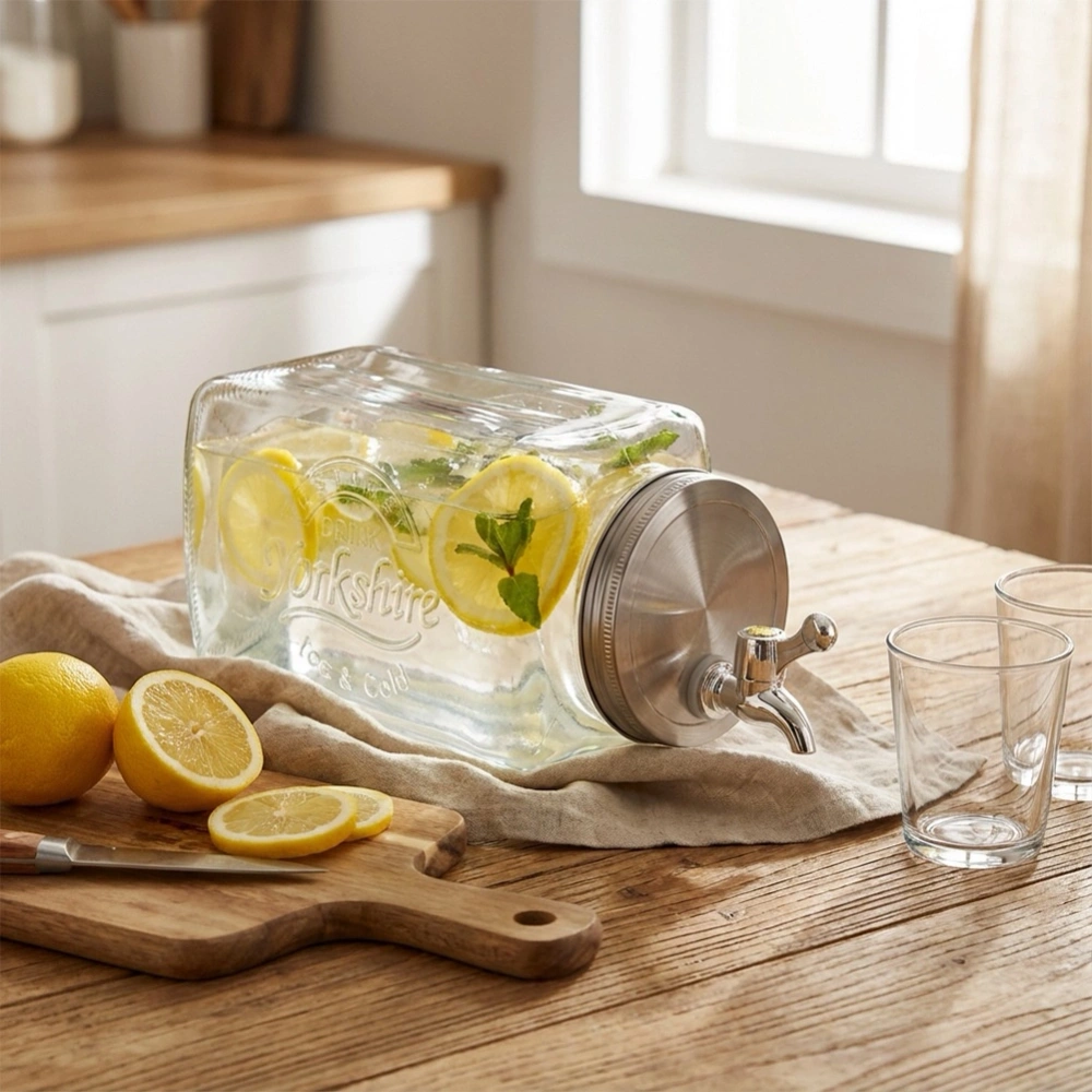 Szklany dystrybutor z kranikiem idealny do serwowania wody, lemoniady, soku, herbaty mrożonej, wody smakowej, ale również ponczu. Dostosowany do przechowywania w lodówce. Dzięki kranikowi w łatwy sposób zaserwujemy ulubione napoje w sposób efektowny. Słój wykorzystamy zarówno w ogrodzie, jak i podczas spotkań rodzinnych. Oryginalny produkt marki Vilde. Wyprodukowano zgodnie z europejskimi standardami.