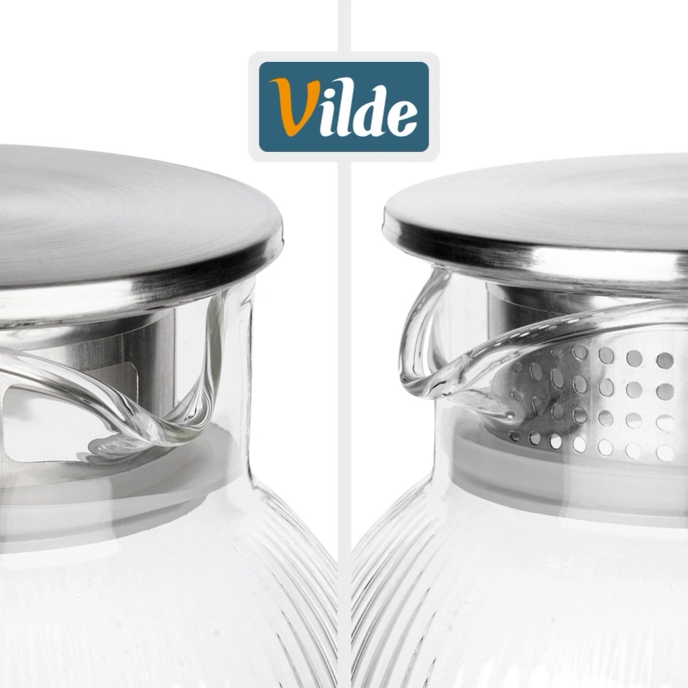 Szklany dzbanek do napojów z pokrywką wyposażoną w sitko, które zapobiega wpadaniu owoców, lodu i ziół podczas nalewania. Wygodny w użytkowaniu i łatwy w czyszczeniu. Dzbanek świetnie sprawdzi się do serwowania różnych napojów. Możemy przechowywać w nim napoje w lodówce. Posiada klasyczny kształt, dzięki czemu idealnie pasuje do każdej zastawy. Oryginalny produkt marki Vilde. Wyprodukowano zgodnie z europejskimi standardami.