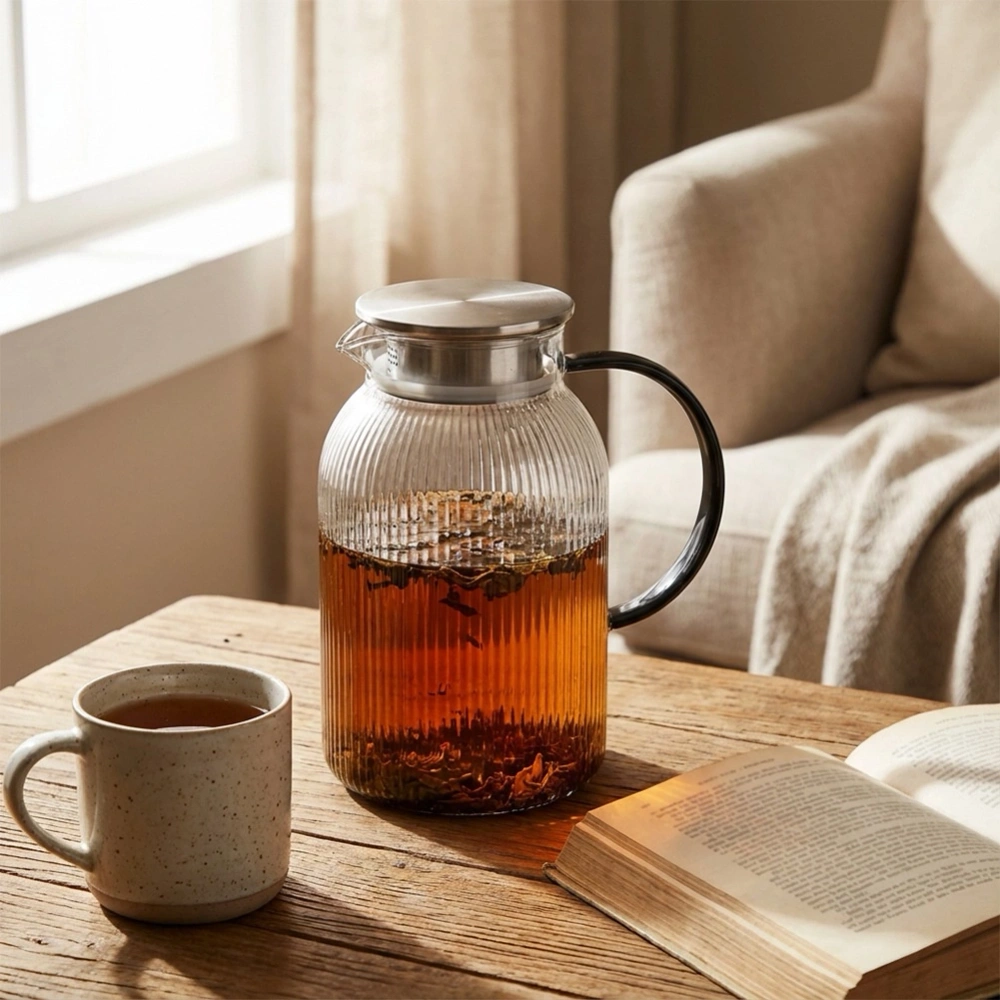 - Wykonany ze szkła borokrzemowego - Dzbanek wykonany z najwyższej jakości szkła w przezroczystym kolorze. Posiada ryflowaną strukturę, która nadaje mu elegancki i dekoracyjny wygląd oraz przyciąga wzrok. Uchwyt w kolorze czarnym. Wyposażony w pokrywkę wykonaną ze stali nierdzewnej w złotym kolorze.