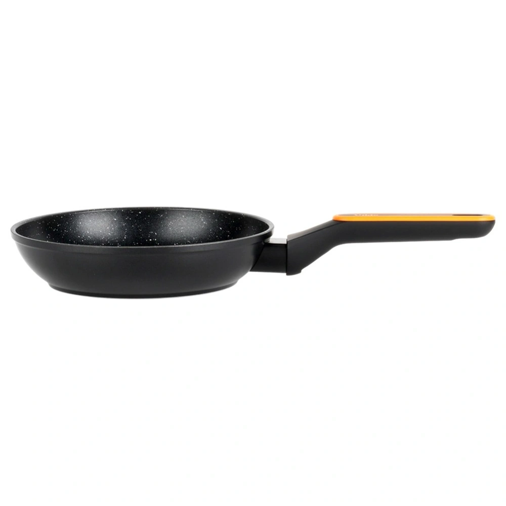 - Nieprzywierająca powłoka granitowa - Patelnia wykonana z aluminium z nieprzywierającą powłoką granitową w czarnym kolorze. Powierzchnia nieprzywierająca umożliwia przygotowywanie zdrowych i smacznych posiłków z minimalną ilością tłuszczu. Wyposażona w uchwyt wykonany z najwyższej jakości, wytrzymałego tworzywa w czarnym i pomarańczowym kolorze.