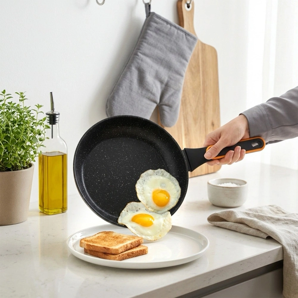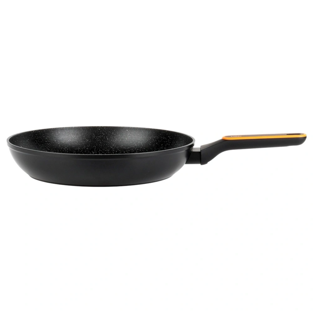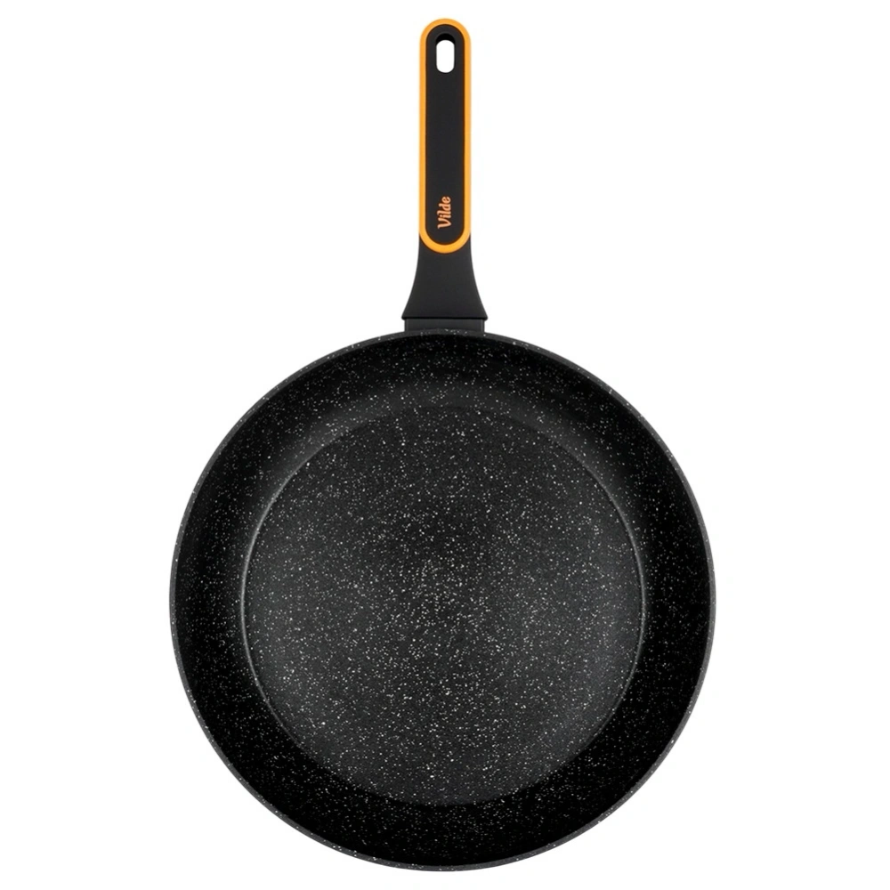 - Nieprzywierająca powłoka granitowa - Patelnia wykonana z aluminium z nieprzywierającą powłoką granitową w czarnym kolorze. Powierzchnia nieprzywierająca umożliwia przygotowywanie zdrowych i smacznych posiłków z minimalną ilością tłuszczu. Wyposażona w uchwyt wykonany z najwyższej jakości, wytrzymałego tworzywa w czarnym i pomarańczowym kolorze.