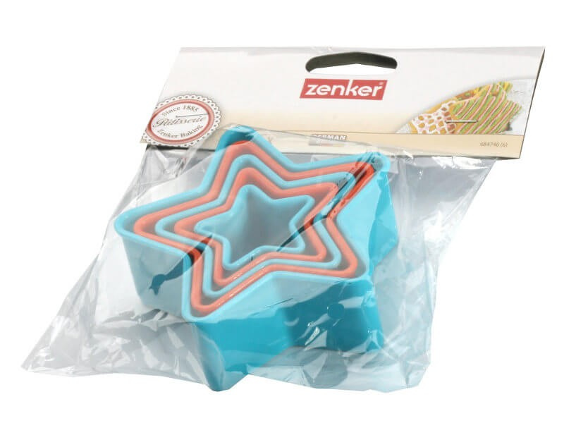 - Komplet do wykrawania ciasteczek marki ZENKER niemieckiej firmy Fackelmann składa się aż z 5 foremek. Foremki są w kształcie gwiazdek o różnych rozmiarach. Piękne, żywe kolory sprawią, że dzieci będą chciały uczestniczyć w przygotowywaniu wypieków.