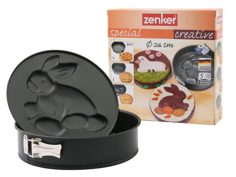 - Tortownica Wielkanocna o średnicy 26 cm z wymiennym dnem z tłoczeniem w kształcie zająca oraz baranka Zenker niemieckiej firmy Fackelmann zapewnia równomierne nagrzewanie się naczynia.