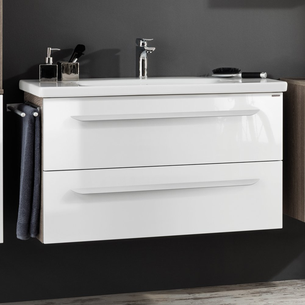 - Szafka łazienkowa pod umywalkę 97 cm w kolorze koniakowy dąb/ biały wysoki połysk. Produkowana w Niemczech z najwyższej jakości materiałów gwarantuje idealne dopasowanie do każdej łazienki.