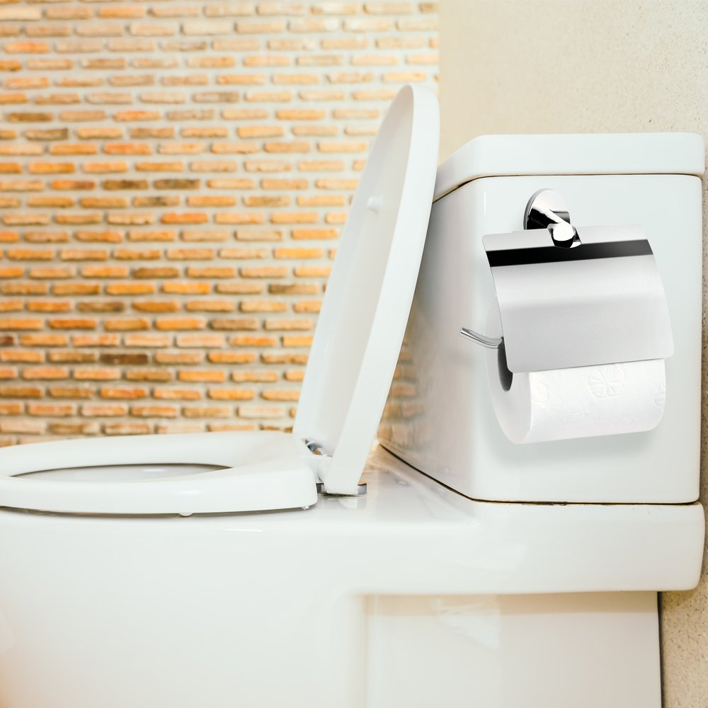 Uchwyt łazienkowy na papier toaletowy montowany na wkręty ukryte w ścianie.